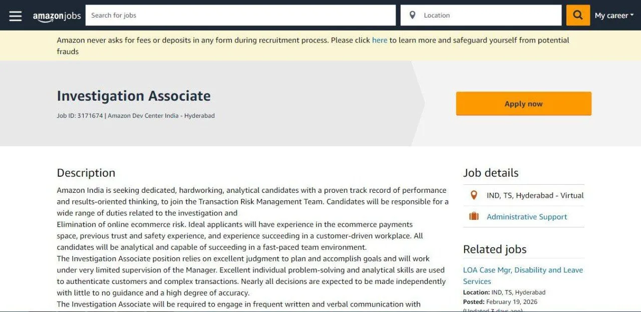 Amazon announced job vacancy for the post name of Investigation Associate. The place of posting will be at Hyderabad. Candidate who have completed Graduate/ Engineering/ Post Graduate with Freshers and Experience are eligible to apply for this job. More details about qualification, job description, roles and responsibilities are as follows.