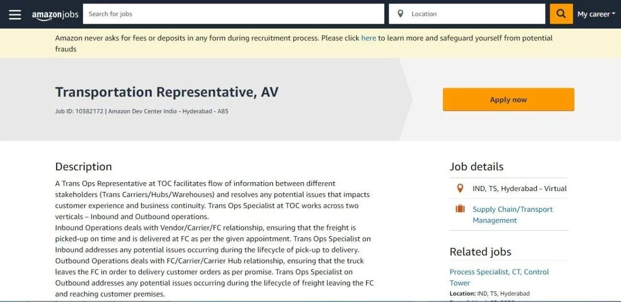 Amazon announced job vacancy for the post name of Transportation Representative. The place of posting will be at Remote (Work From Home) – Hiring Office in Hyderabad. Candidate who have completed Graduate/ Engineering/ Post Graduate with Freshers and Experience are eligible to apply for this job. More details about qualification, job description, roles and responsibilities are as follows.