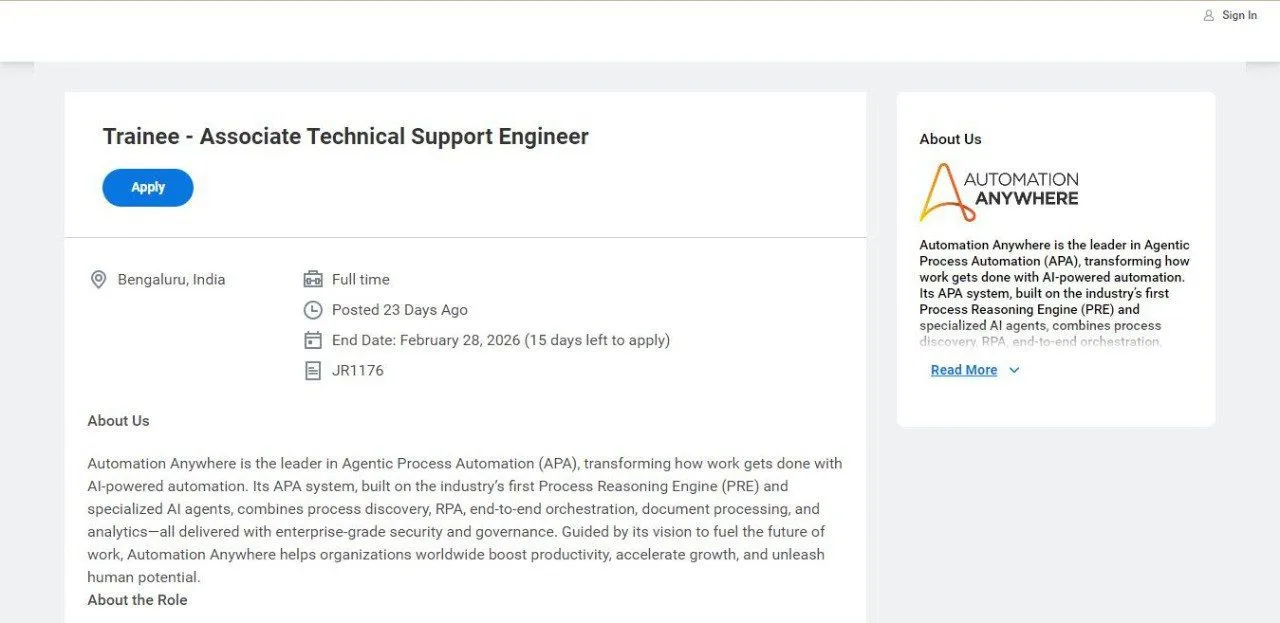 APPLY LINK – https://automationanywhere.wd5.myworkdayjobs.com/AutomationAnywhereJobs/job/Bengaluru-India/Trainee—Associate-Technical-Support-Engineer_JR1176