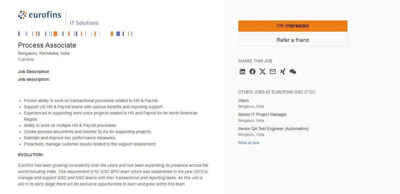 Eurofins announced job vacancy for the post name of Process Associate. The place of posting will be at Bangalore. Candidate who have completed Graduate/ Engineering/ Post Graduate with Freshers and Experience are eligible to apply for this job. More details about qualification, job description, roles and responsibilities are eligible to apply for this job.
