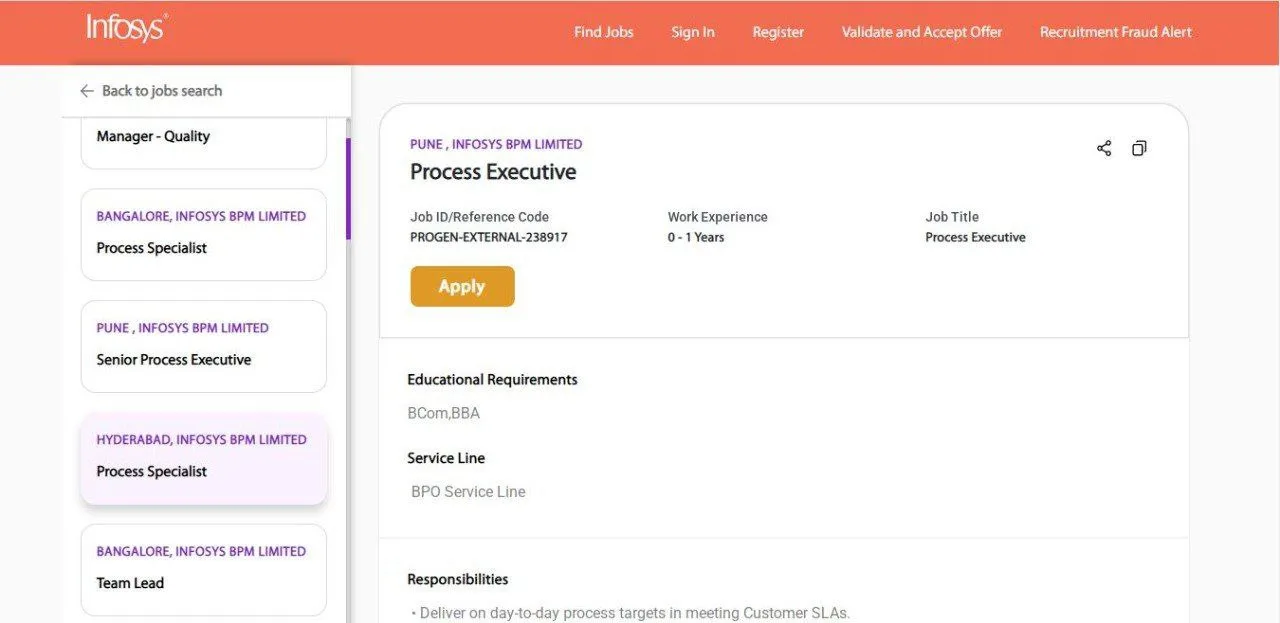 Infosys announced job vacancy for the post name of Process Executive. The place of posting will be at Pune. Candidate who have completed Graduate/ Engineering/ Post Graduate with Freshers and Experience are eligible to apply for this job. More details about qualification, job description roles and responsibilities are as follows.