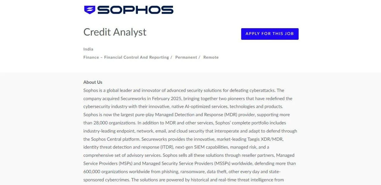 Sophos announced job vacancy for the post name of Credit Analyst. The place of posting will be at Remote. Candidate who have completed Graduate/ Engineering/ Post Graduate with Freshers and Experience are eligible to apply for this job. More details about qualification, job description, roles and responsibilities are as follows.