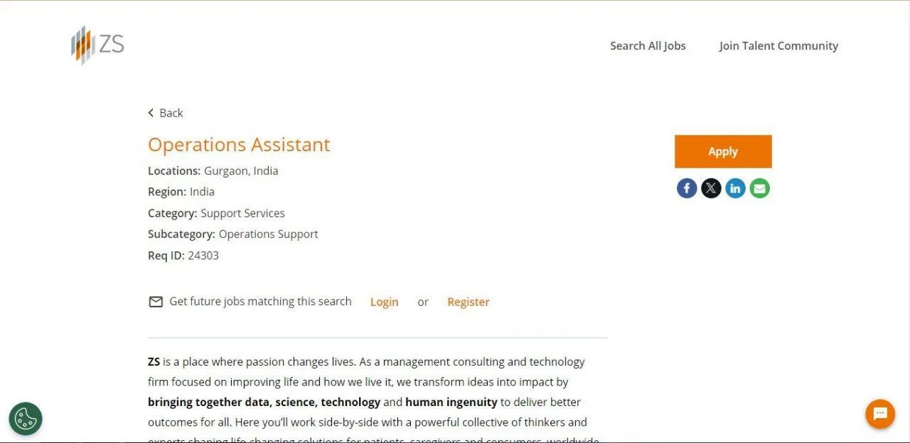 ZS announced job vacancy for the post name of Operations Assistant. The place of posting will be at Gurgaon. Candidate who have completed Graduate/ Post Graduate/ Engineering with Freshers and Experience are eligible to apply for this job. More details about qualification, job description, roles and responsibilities are as follows.